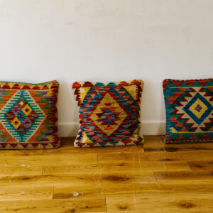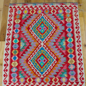 This rug features a stunning geometric pattern, this rug boasts a orange and ruby red field , accented by vibrant tones of green , purple , blue and cream creates a harmonious and elegant design.