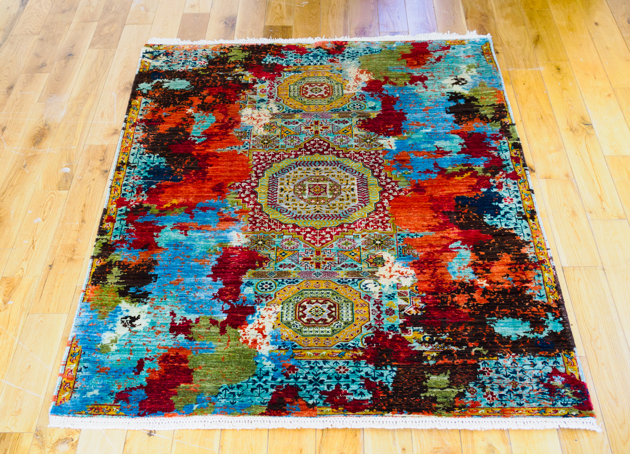 Size : 181 x 153 cm Provenance : Maimana , North Afghanistan Weaving : Hand Knotted Pile Material : 100% Wool Quality Guarantee : Very Durable And Washable Environmentally Sustainable : 100% Natural Wool, 100% Vegetable-Based Dye