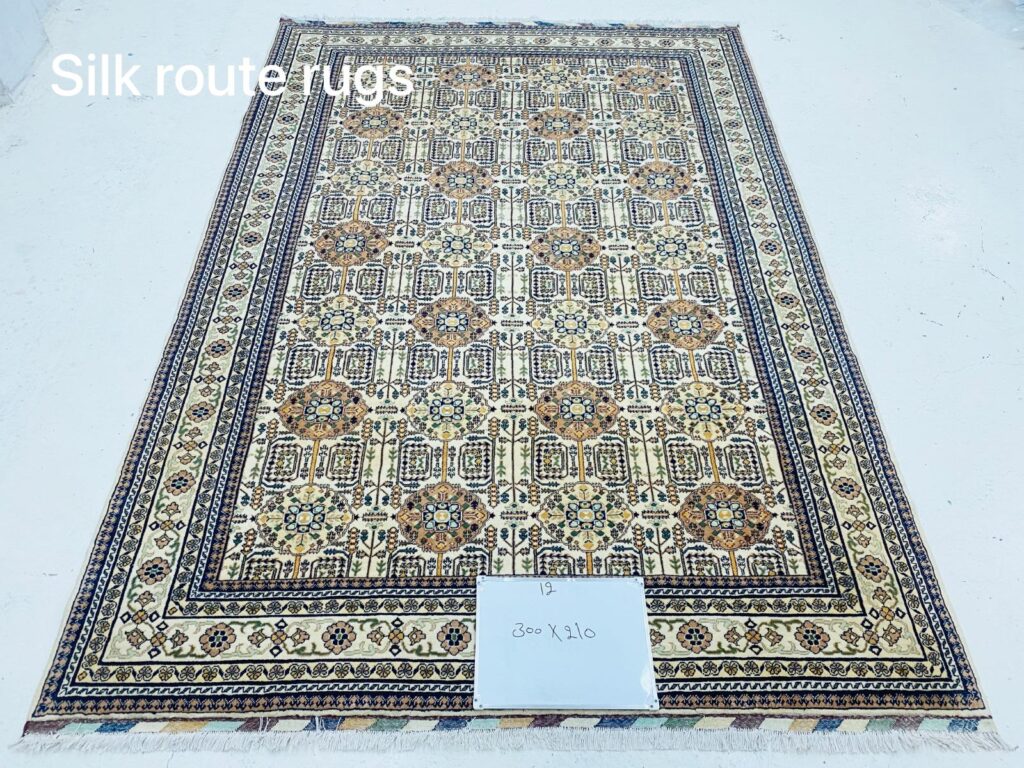 This ornate rug features a symmetrical pattern with intricate floral and geometric motifs in shades of brown, beige, blue, and cream. The detailed borders frame the central design beautifully, adding a touch of elegance and sophistication to any room. Made from high-quality materials and natural fibers, this rug is both stunning and durable. This exquisite...
