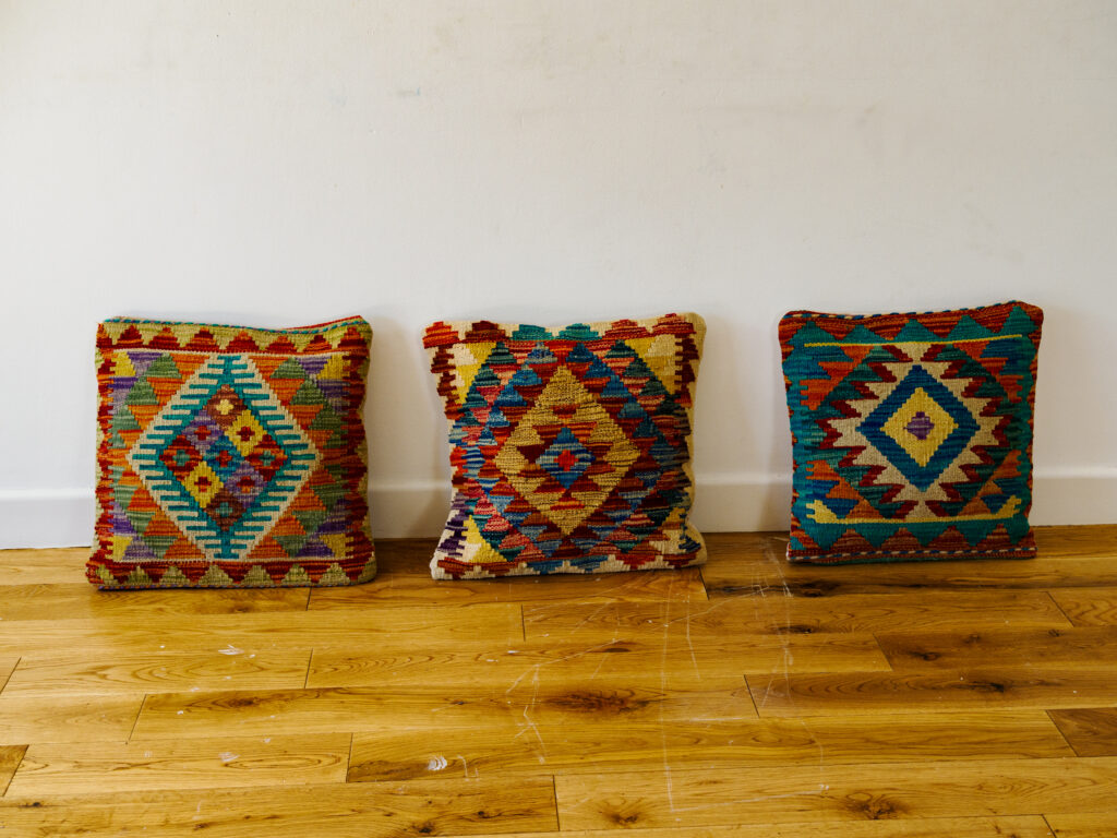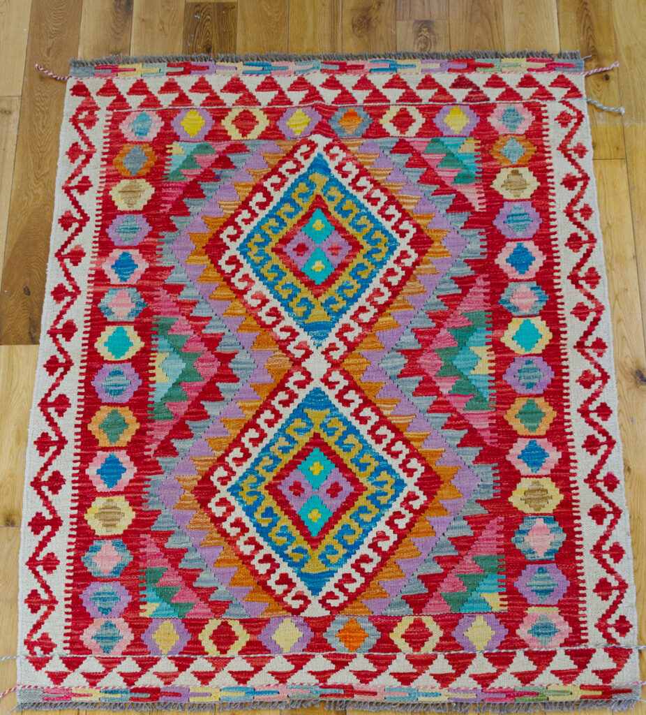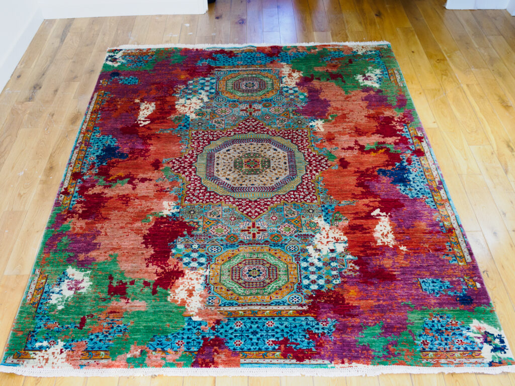 Featuring a stunning geometric pattern, this rug boasts a ruby red and light blue field with a crème border, accented by vibrant tones of orange, blue, cream and pistachio green . Size: 1.97 × 1.62m (7’7" x 6’3") Price: £1,150 This exquisite Mamluk-style rug is crafted in Afghanistan, reviving the beauty of ancient museum-quality carpets...