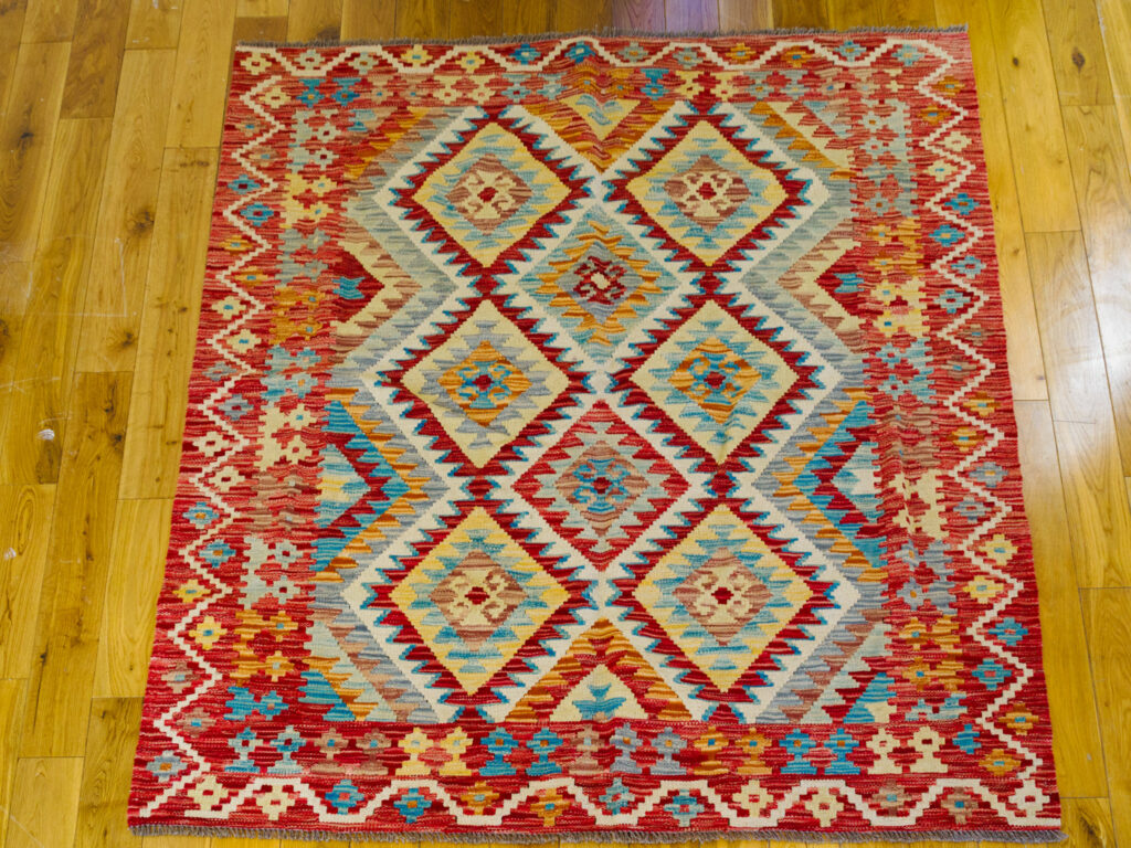 Size : 181 x 153 cm Provenance : Maimana , North Afghanistan Weaving : Hand Knotted Pile Material : 100% Wool Quality Guarantee : Very Durable And Washable Environmentally Sustainable : 100% Natural Wool, 100% Vegetable-Based Dye